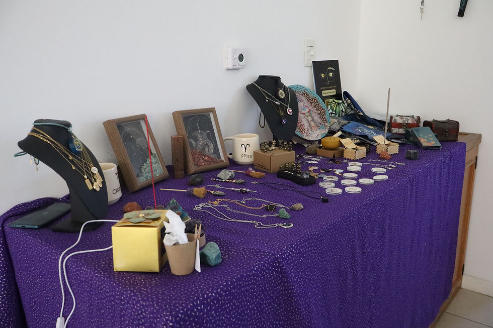 Entre los objetos de culto que hay en la tienda están los que forman parte de los servicios, como las cartas astrológicas, los dados astrológicos — nuevos, lúdicos, que sirven para hacer lecturas sencillas — las cartas de tarot y los oráculos. Según Carina, parte del stand involucra armar un altar: “También en las tiradas usamos sahumerios porque eso mueve energías. Sirve para que a nosotras no nos queden pegadas las energías ajenas. Después tenemos piedras de protección, varitas mágicas, amuletos (monedas astrológicas) y los sahumamos para que potencien nuestros signos y nos protejan a nosotras y a los consultantes”.